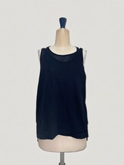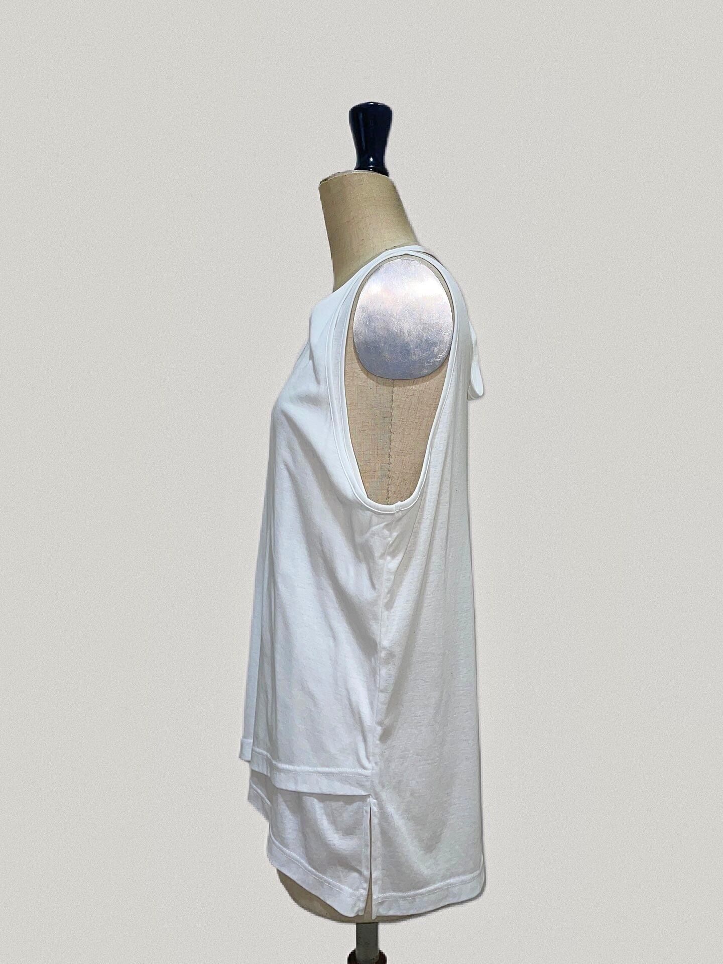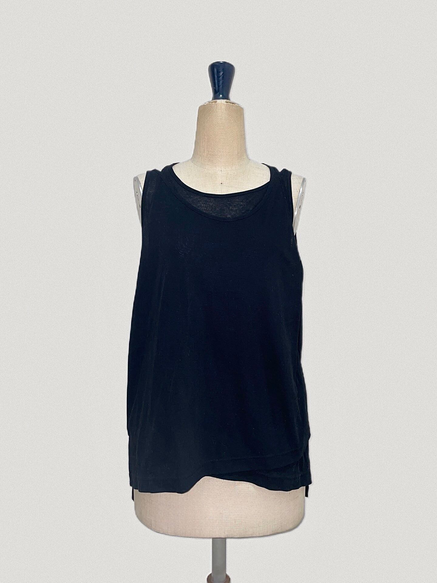2枚のタンクトップをレイヤードさせたデザインで、ネックや裾にかけて重なり合った仕上がりが特徴です。