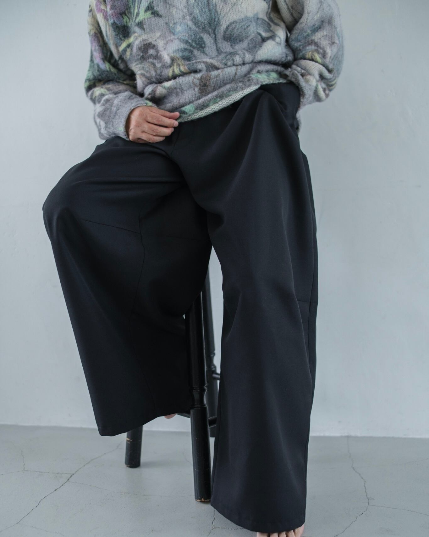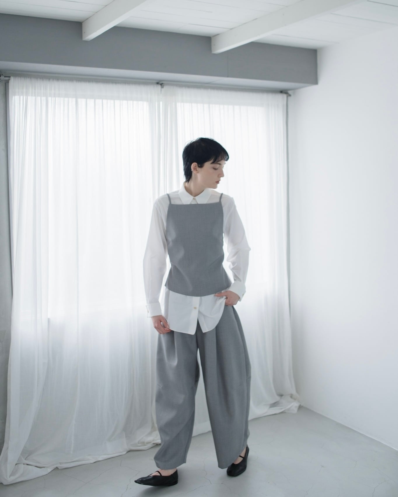 タックやダーツを差し込むことにより素材が持つハリや立体感を際立たせるだけでなく、ハイウエストでヒップ回りにも余裕を持たせ、そのボリュームのまま裾まで流れていく曲線的なラインもnabikiのアイデンティティを表現しています。